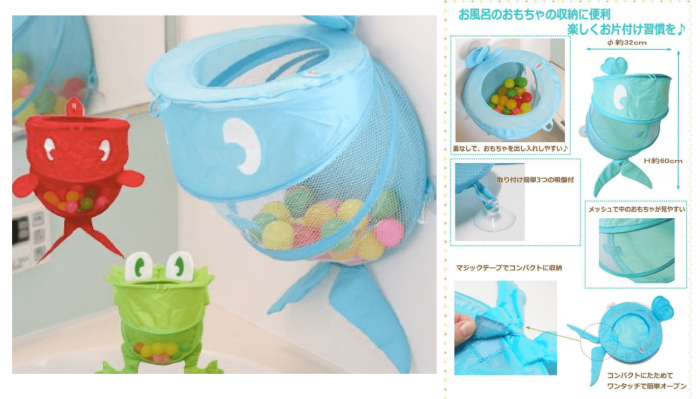 メッシュなどの通気性のいい収納カゴやバッグを使えば、その悩みも解決します。また、子供が自分で片付けるように慣れば、お風呂の時間にイライラする事も減ります。