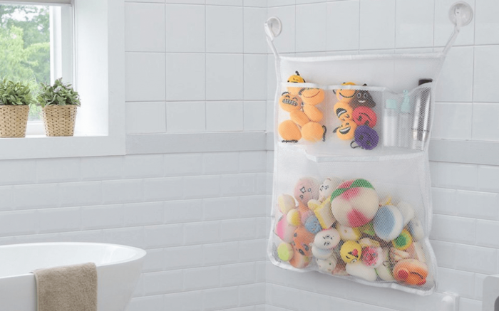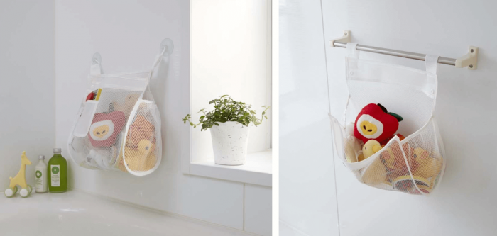 この収納袋は、メッシュタイプのものなので、通気性がよく、中に入れたおもちゃも乾きやすい。そして、強力フックがついているので、子供の背の高さに合わせて壁に装着できるのも嬉しいですね。