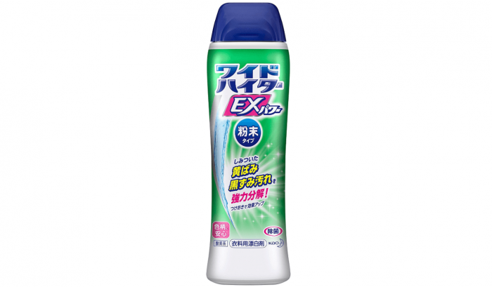 この掃除のポイントは、ワイドハイター 粉末タイプを使うこと。ワイドハイター EXパワー粉末は、洗濯物の黄ばみや黒ずみ・食べ残しなどのシミ汚れの時に使う洗剤。