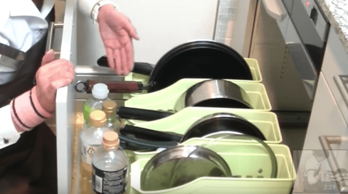 まずは、フライパンや鍋、調味料を中心に収納しているアイデアを紹介。