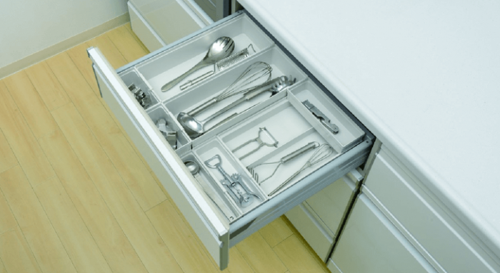 このアイテムは、キッチン用の薄いケースです。だから、高さのない収納スペースにすっぽり収まります。いろんな大きさがあるので、色んなケースと組み合わせて使えますよ。