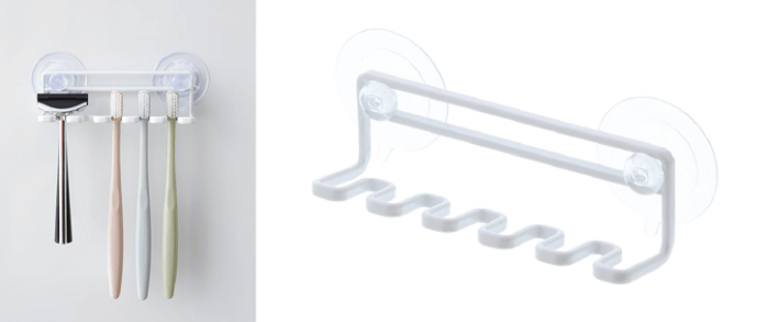 吸盤を外せば、フックとして使うこともできます。だから、先ほど紹介した歯ブラシ スタンドに掛けて収納できます。