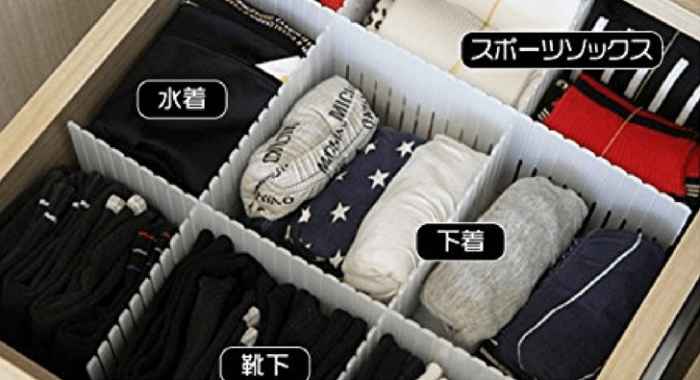 ゴチャゴチャになりやすい引き出し収納は、仕切りを使えば◎。靴下や下着などの小物もスッキリ収納できますよ。