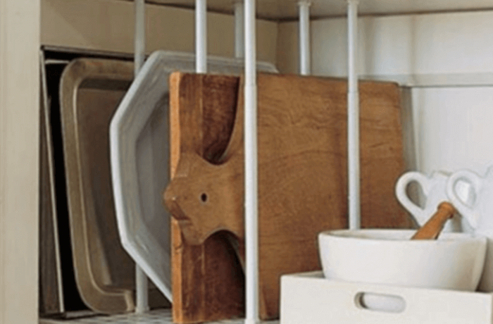 色んな場面で使える突っ張り棒。これは、大きなお皿や木のプレートを収納するのに使用しています。